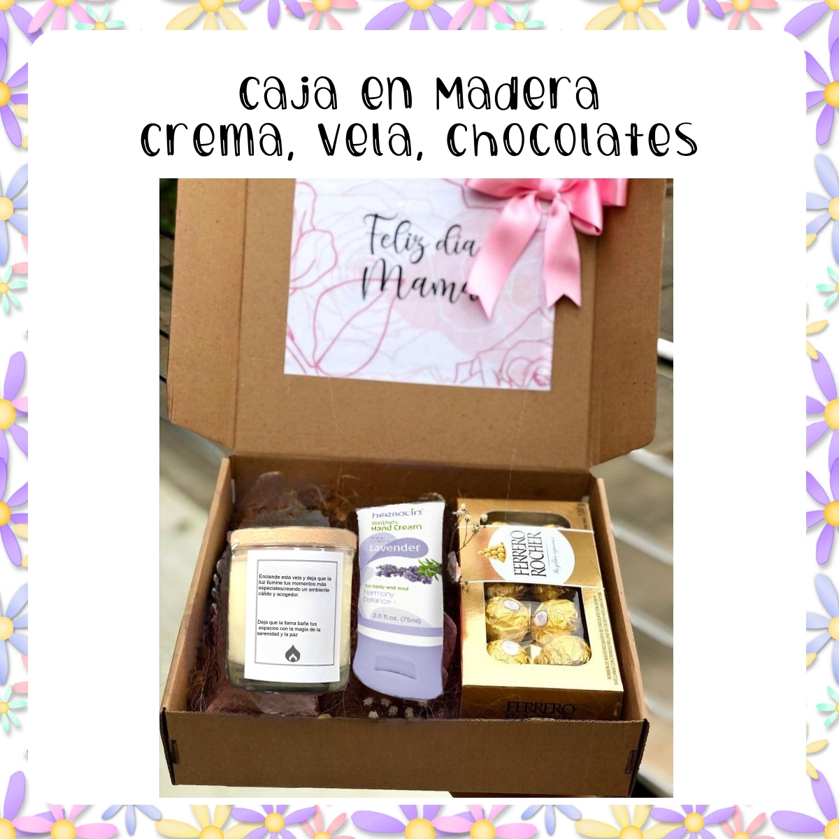La exquisitez de nuestro regalo especial para el Día de la Madre te cautivará. Disfruta de la fragancia cautivadora de una vela aromática, disfruta de finos chocolates y cuida tus manos con una crema suavizante en nuestra caja de recuerdo de madera. Este regalo cuidadosamente elaborado es más que un simple presente; es un tributo a la maternidad. Celebra a tu madre con este gesto cuidadosamente pensado que le iluminará el día y le recordará cuánto la valoras. ¡Convierte cada momento en una experiencia sensorial única!