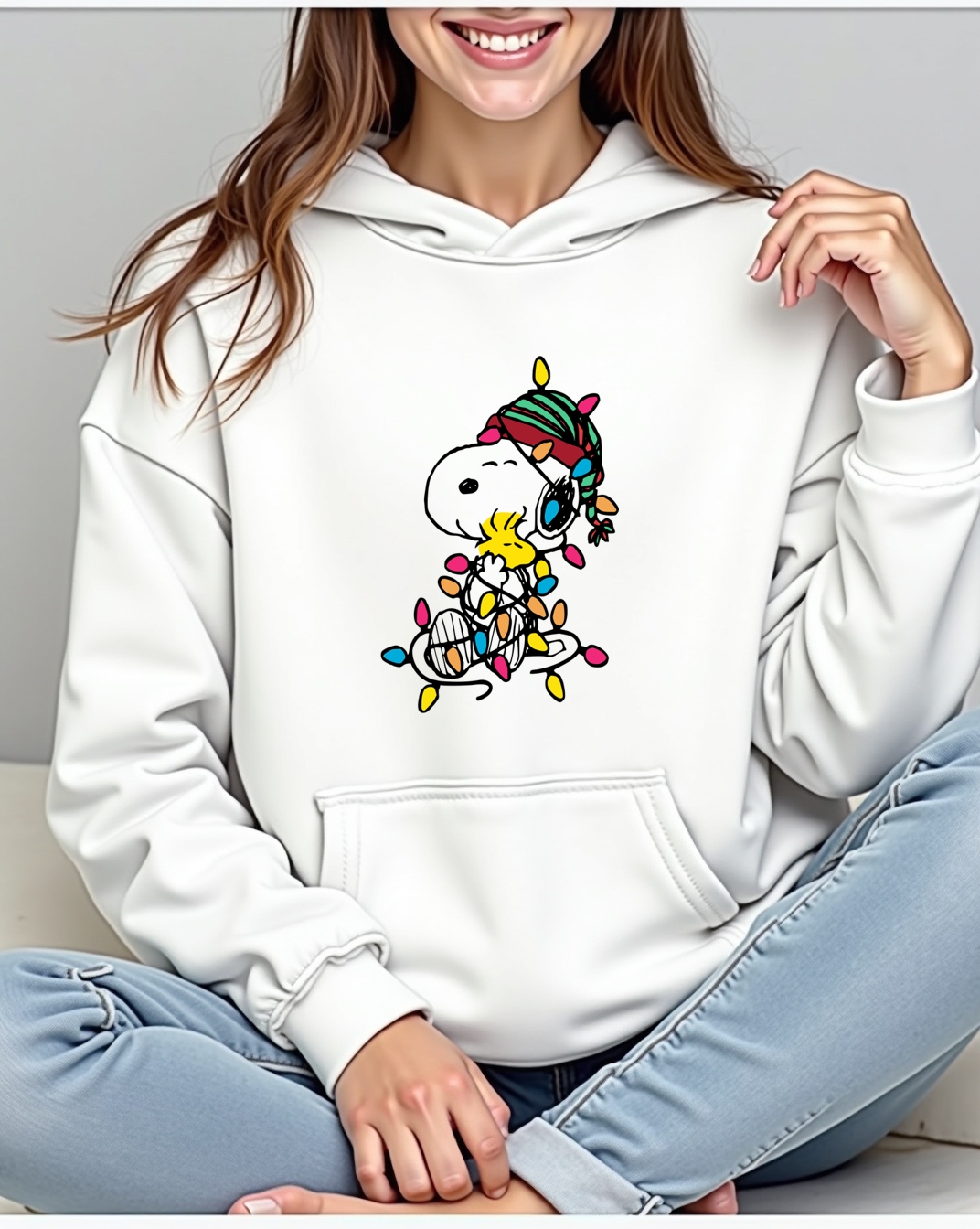 Confeccionada con tela de alta calidad 100% algodón, esta sudadera no solo es suave y cálida, sino también ideal para lucir en reuniones familiares, fiestas con amigos o en tu sesión de fotos navideñas. El diseño de Snoopy, rodeado de luces navideñas, combina ternura y espíritu festivo, haciéndola un verdadero imprescindible de la temporada.